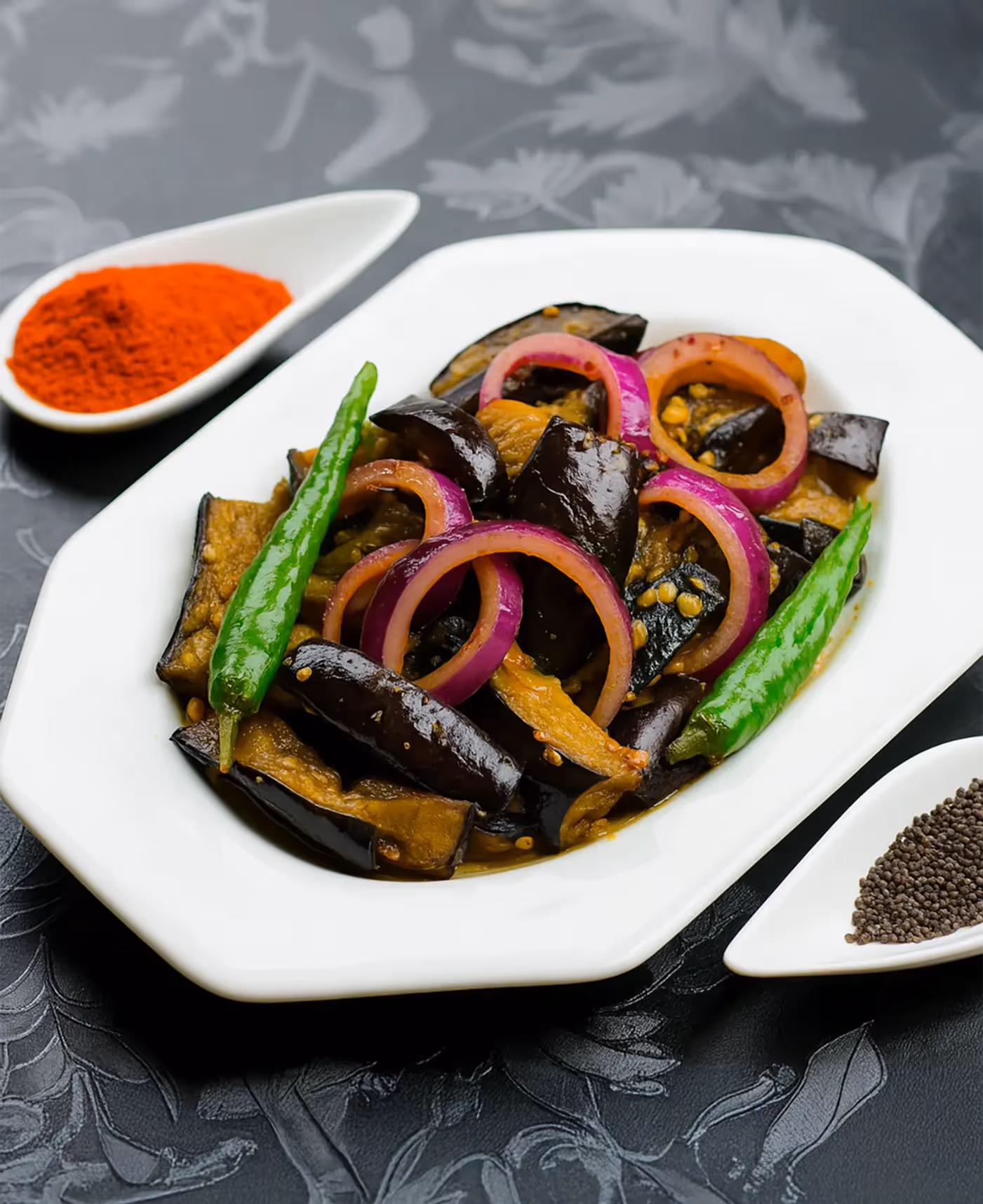 Pickled eggplant with sweet, sour, and spicy flavors.