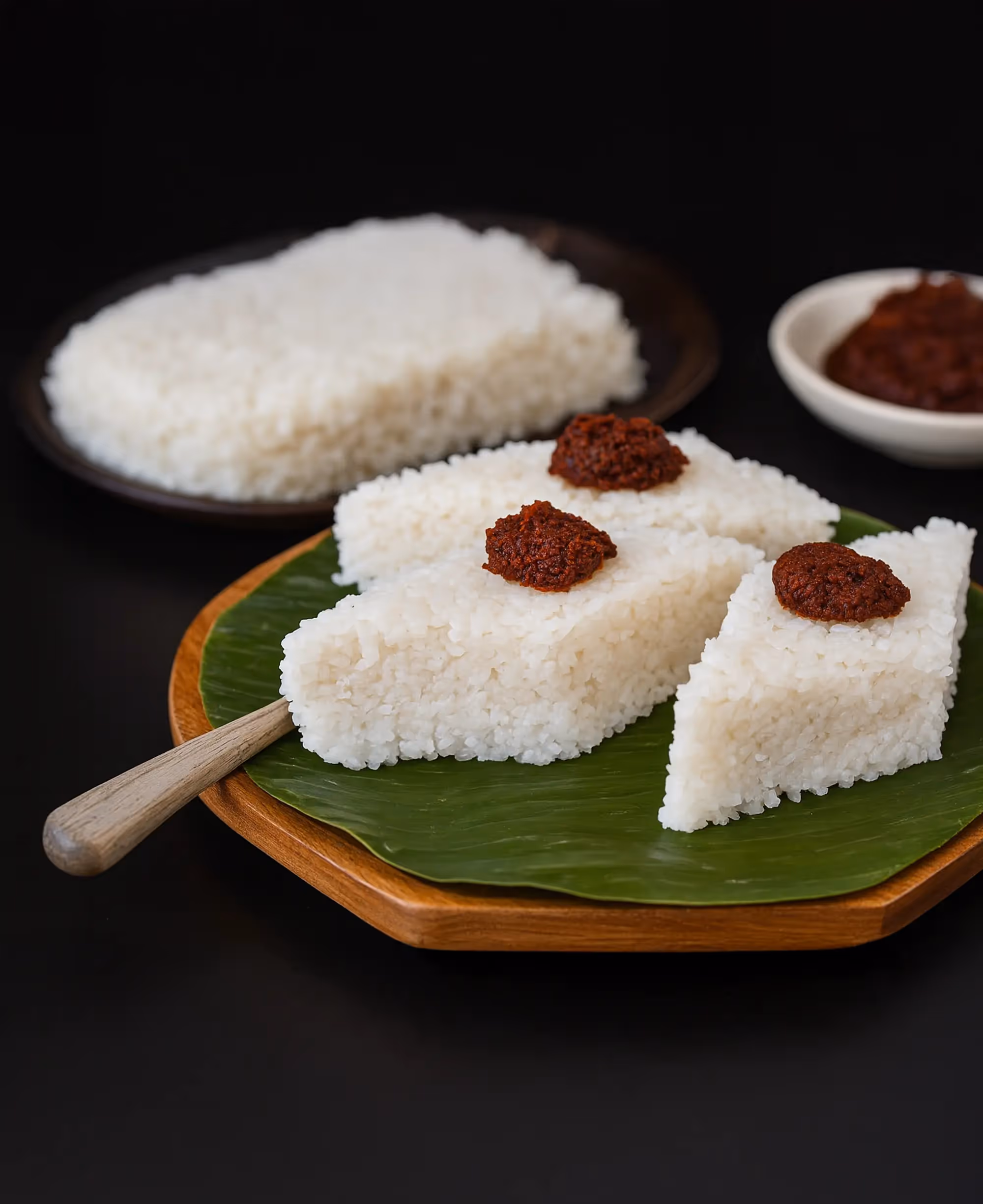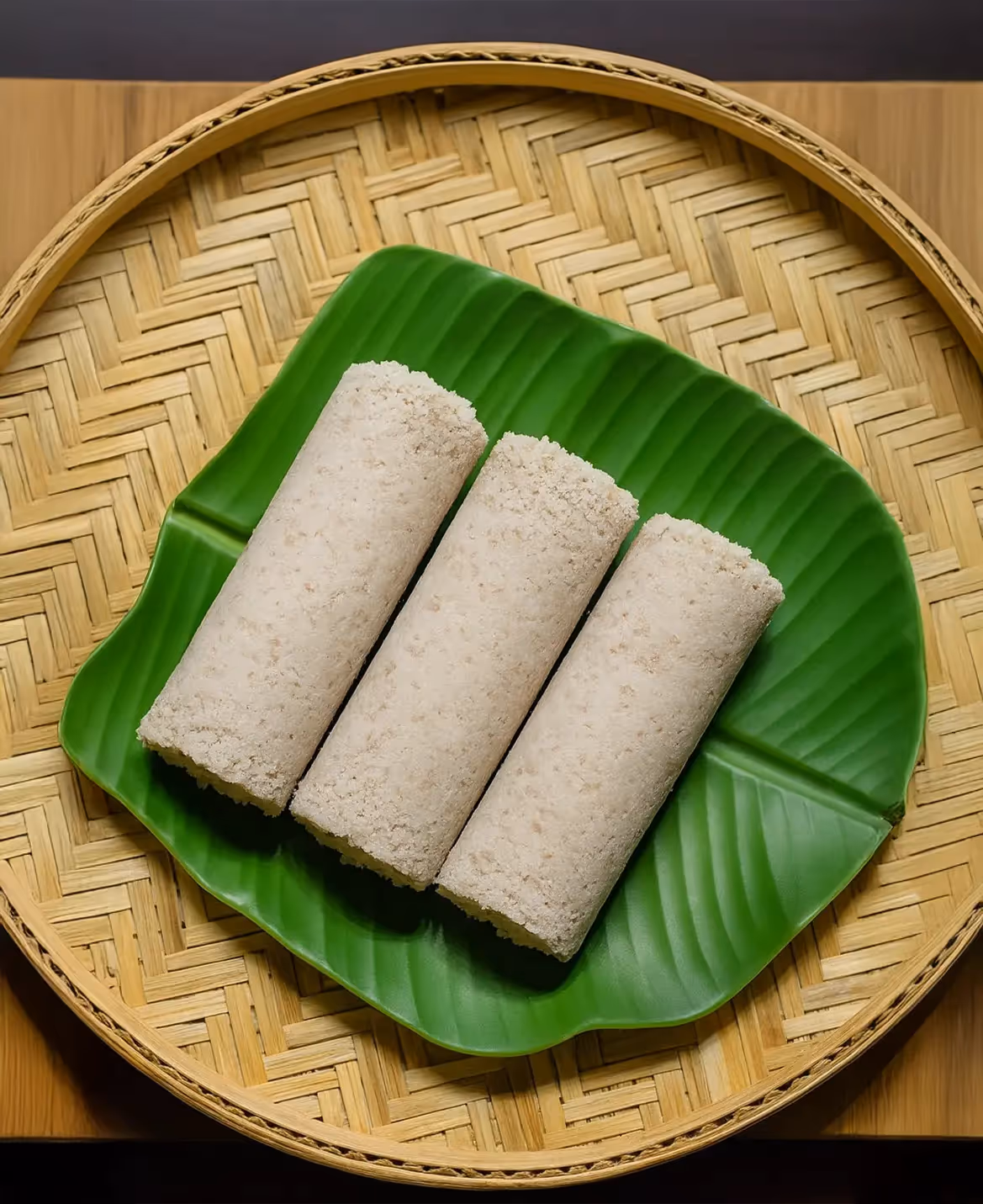 Steamed cylinders of rice flour and coconut, often served with curry or coconut milk.