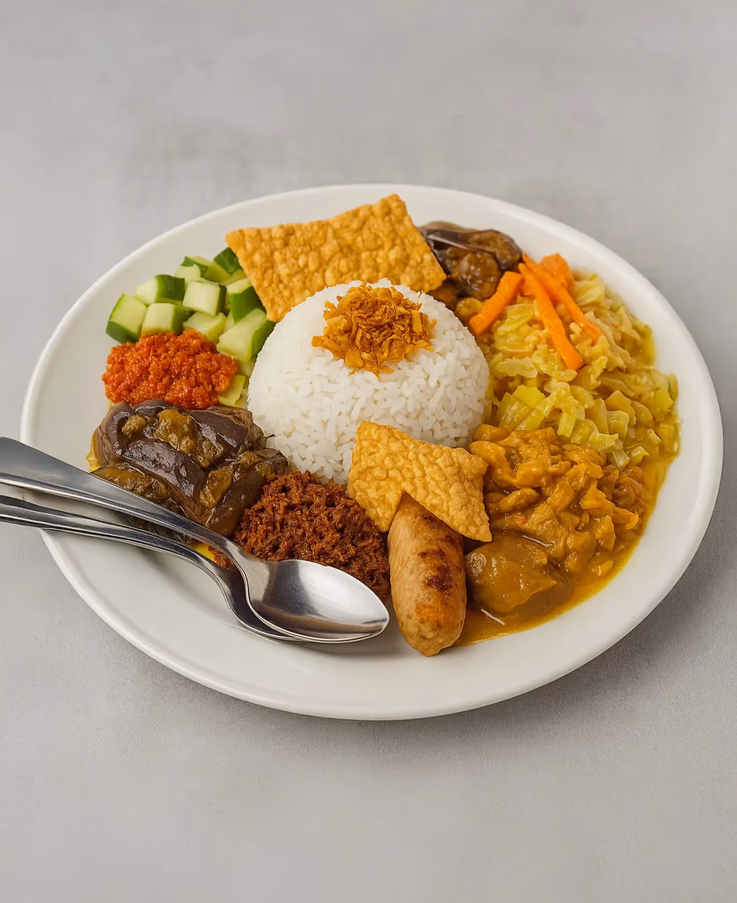 Mixed rice dish with small portions of meats, vegetables, peanuts, and sambal.