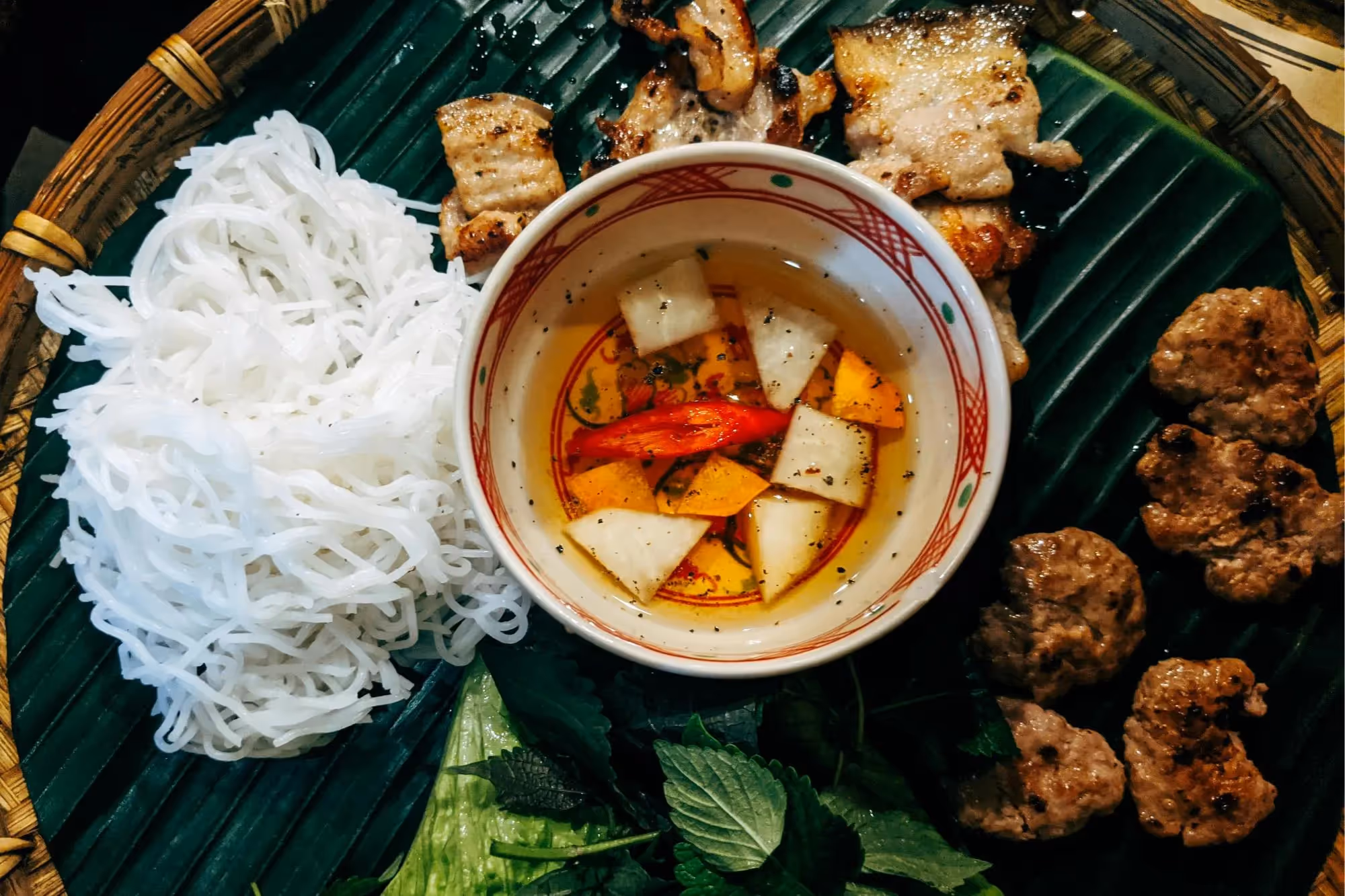 Grilled pork patties and belly slices bobbing in a warm, sweet-sour broth, served with cold noodles, herbs, and a side of joy. It’s smoky, messy, and famously devoured by Obama and Bourdain in Hanoi. Need we say more?