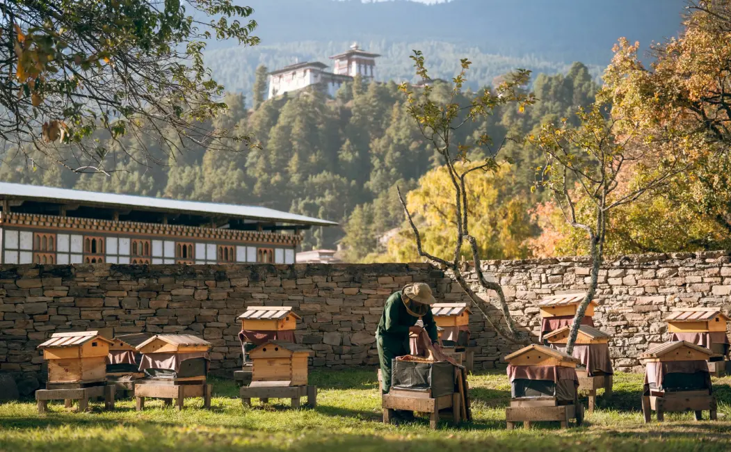 16 suites arranged across a courtyard-style property, each featuring a bedroom and living space with a bukhari (wood-burning stove) and terrazzo bath. A central lodge houses dining and lounge areas, while a spa offers treatments along with steam and sauna facilities. Dining is all-inclusive, with Bhutanese, Indian and Western menus. Compared to other lodges, the experience here is less about facilities and more about proximity to Bhutan’s cultural and religious core.