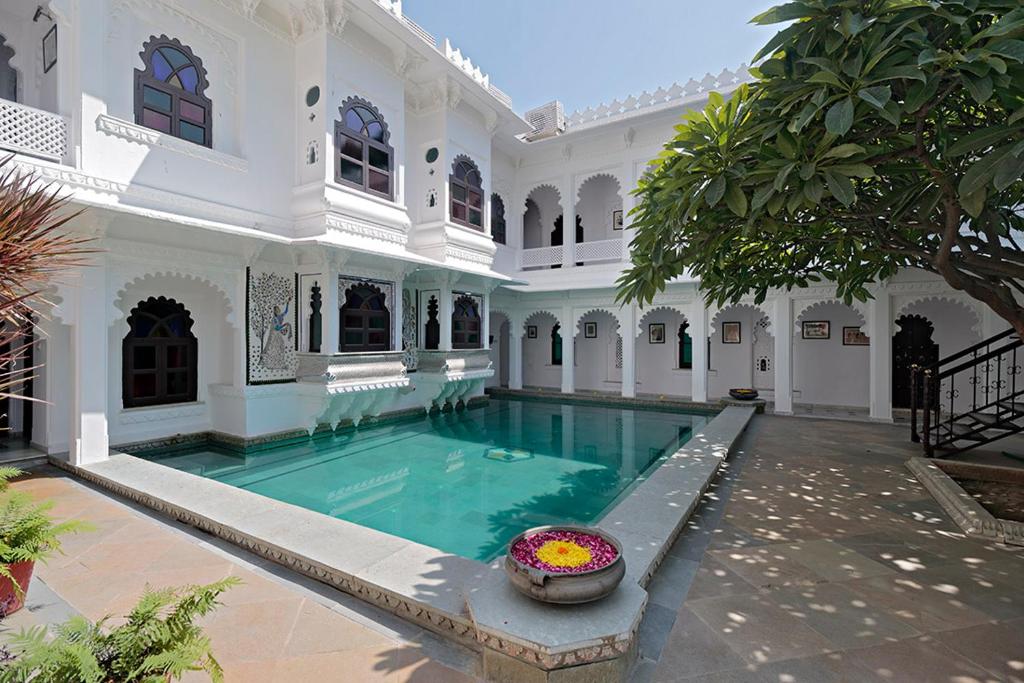 22 rooms: 8 heritage suites, 8 super deluxe rooms, 6 heritage deluxe rooms. All lake-facing. Rooms vary in size and character; the heritage suites retain original Rajput-era artistry — traditional silks, antique furnishing, stained glass. The property has its own boat, the Garuda, for private lake rides. Swimming pool in the gardens. Direct walking access to Jagdish Temple (600 metres) and the City Palace (1.3 km).
