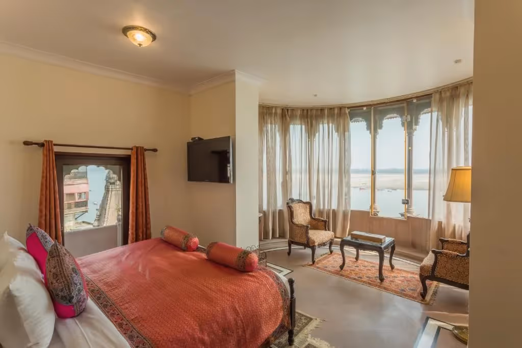 Set on the banks of the Ganges, Brijrama Palace Varanasi is a 19th-century palace turned luxury heritage hotel that offers a regal yet spiritual escape in India’s holiest city. Known as one of the most iconic historic palaces in India, it’s a favorite among travelers from the USA seeking a Ganges riverfront stay and those from Europe looking for a spiritual retreat in Varanasi. With its ornate interiors, traditional music performances, and panoramic views of the river, the palace seamlessly blends cultural immersion with modern luxury, making it one of the most sought-after luxury hotels in Varanasi for foreigners