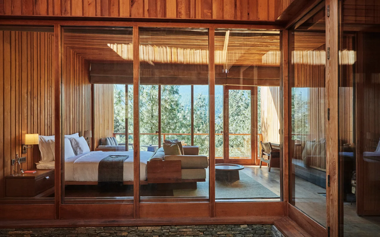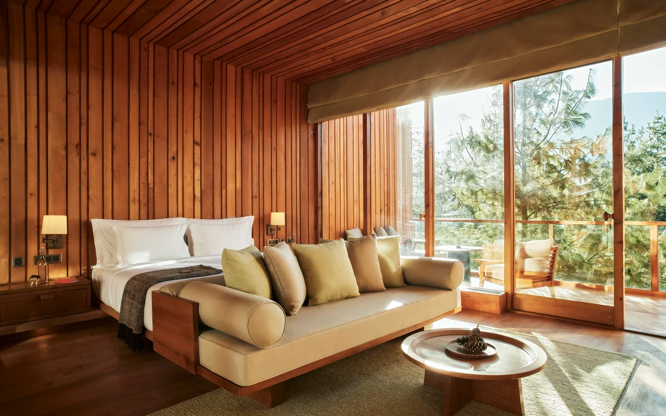 Suites and villas arranged across a spacious property, designed to maximise views of the surrounding valley and forests. Interiors feature natural materials, open layouts and large windows, with a balance of contemporary comfort and Bhutanese design elements. The Six Senses Spa offers wellness programmes and treatments inspired by Himalayan healing traditions. Dining focuses on Bhutanese, regional and international cuisine using locally sourced ingredients.