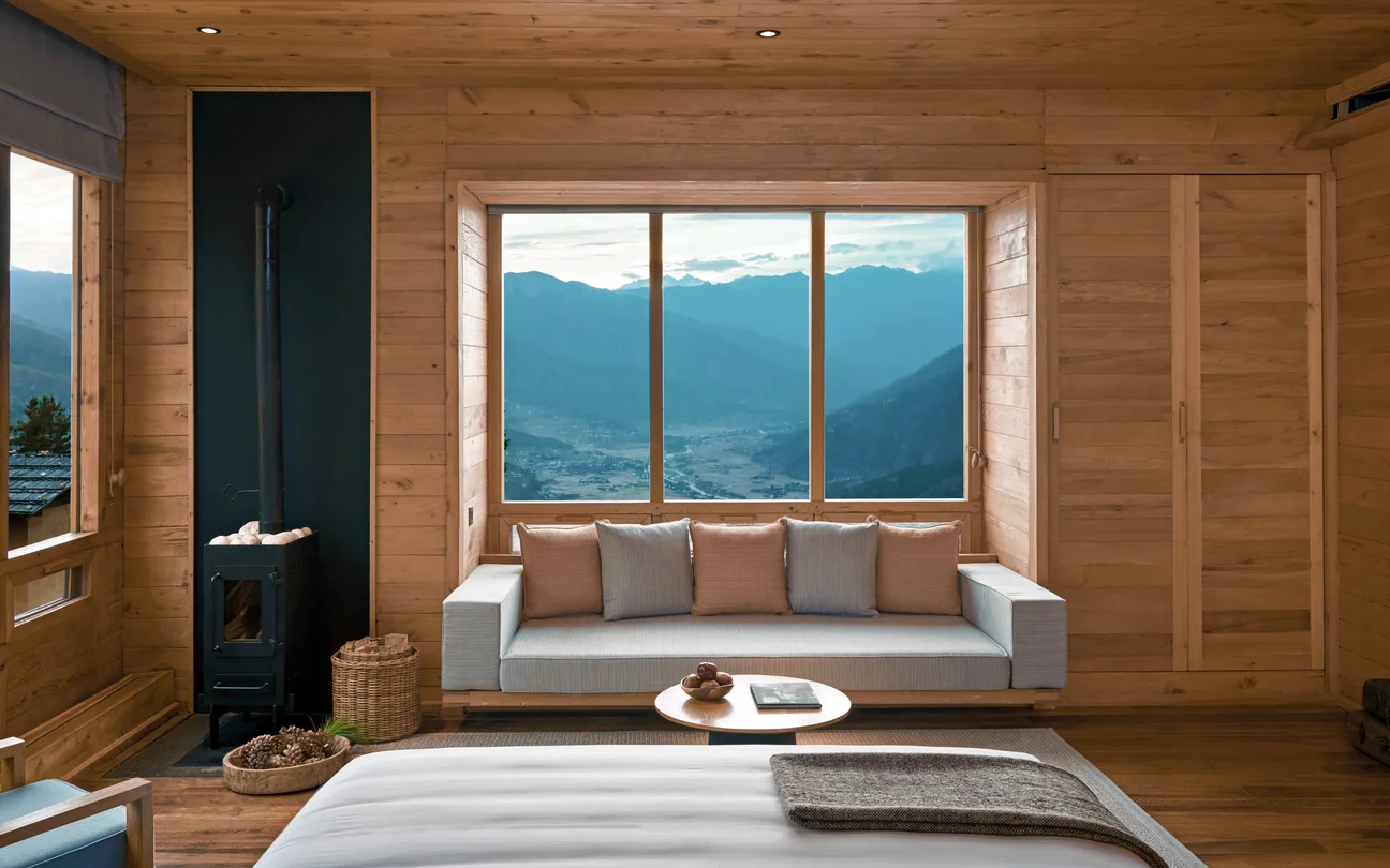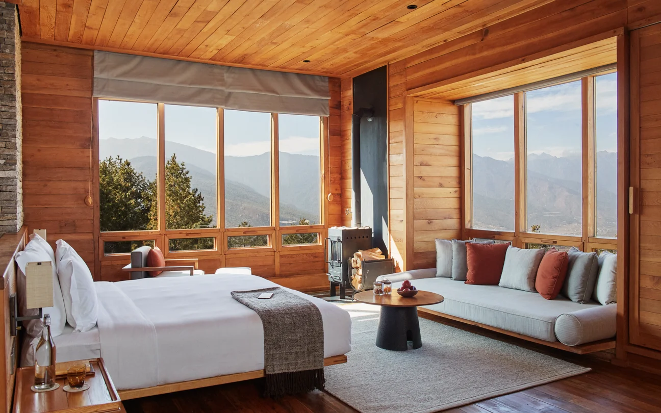 A mix of suites and villas positioned across a hillside property, designed to maximise valley views. Interiors combine natural materials with contemporary finishes, featuring large windows, open-plan layouts and spacious bathrooms. The Six Senses Spa offers treatments inspired by Bhutanese healing practices, along with wellness programmes tailored to altitude and travel recovery. Dining includes both standard restaurant service and curated experiences within the ruins setting.