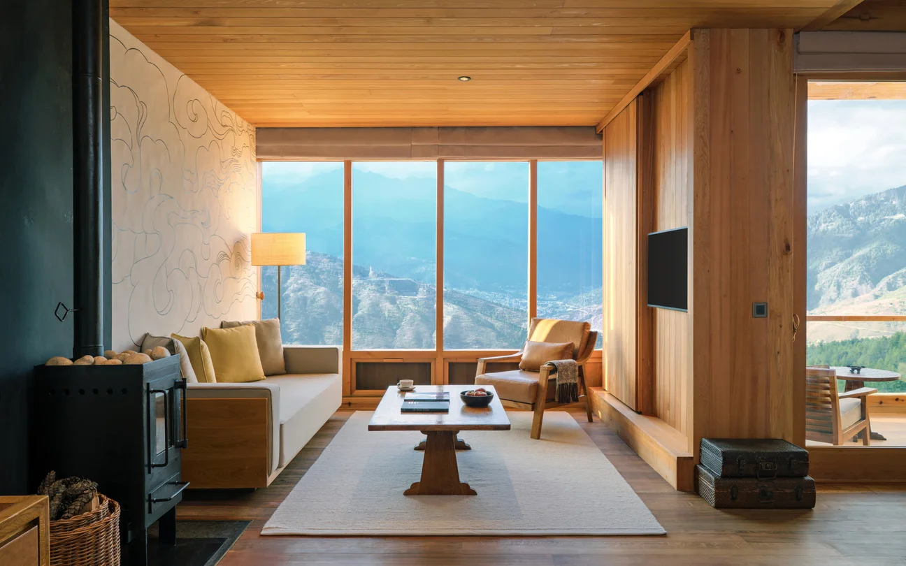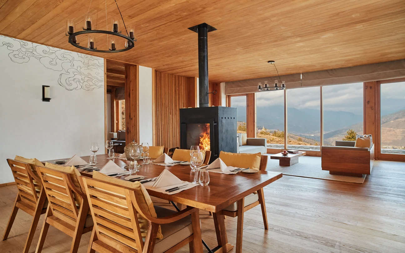 Suites and villas arranged across a hillside property, designed to maximise views over the Thimphu Valley. Interiors feature natural materials, open layouts and large windows, with a balance of modern comfort and Bhutanese detailing. The Six Senses Spa offers wellness programmes, treatments and facilities including steam and sauna. Dining focuses on Bhutanese, regional and international cuisine, with an emphasis on fresh, locally sourced ingredients.